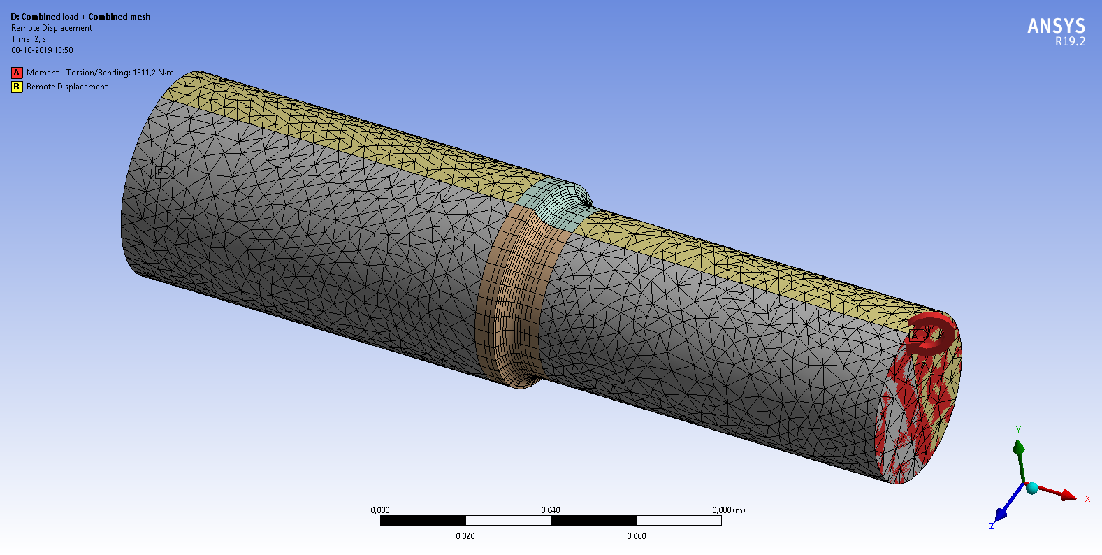 The FE model is evaluated with a combined torsion and bending load, load step 1 minimum load and load step 2 maximum load. The load is the fatigue load to evaluate and is evaluated for a cycle count of N=10^6. As the load from the FE model is the fatigue load to evaluate the load factors are -1 (minimum load) and 1 (maximum load). As the load is 1D load the depth factors are set to 0.